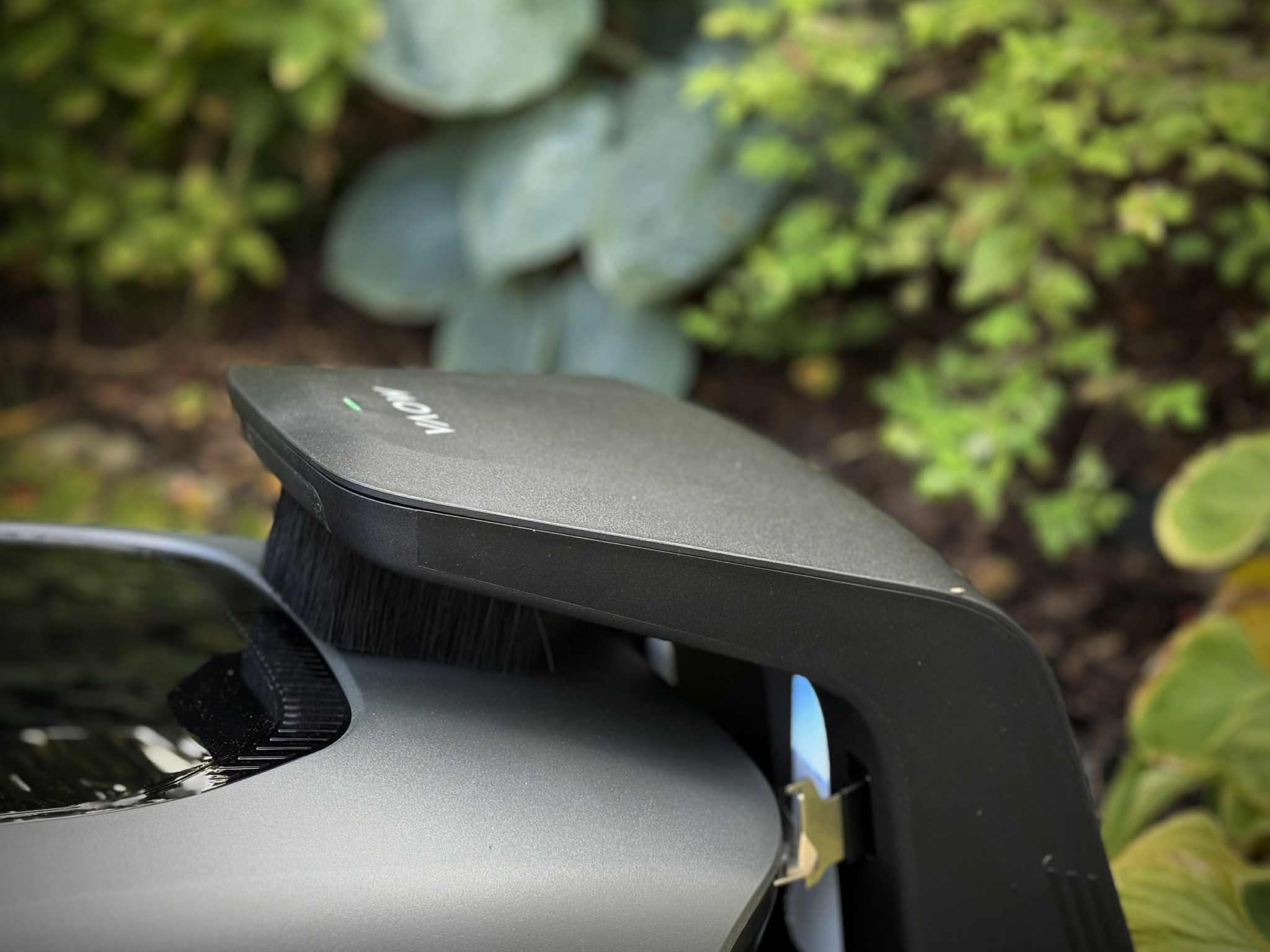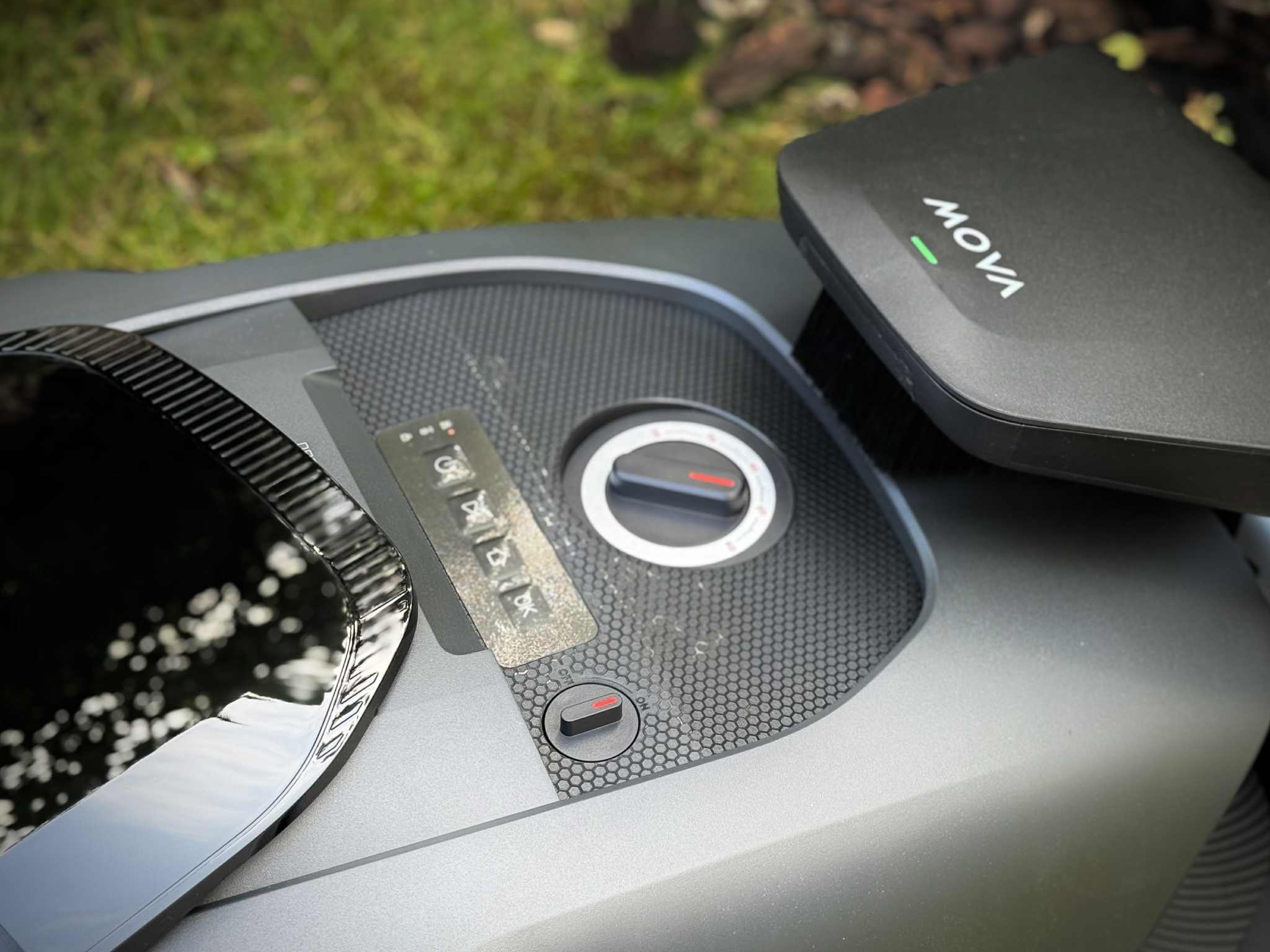 Na pierwszy rzut oka MOVA 600 wygląda jak klasyczny robot koszący: niski, opływowy korpus, duże tylne koła, niższe przednie, dyskretne przetłoczenia. Po bliższym przyjrzeniu uwagę przyciąga jednak charakterystyczna „wieżyczka” z przodu, to właśnie moduł LiDAR, który odpowiada za skanowanie otoczenia i tworzenie mapy ogrodu w czasie rzeczywistym. Całość utrzymana jest w nowoczesnej, dość stonowanej estetyce, która nie gryzie się ani z minimalistycznym tarasem, ani z bardziej tradycyjnym ogrodem.