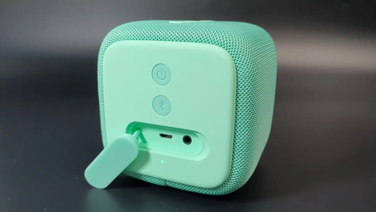 Na drugim panelu producent umieścił ciekawy uchwyt, który pozwala na wygodne zaczepienie głośnika na przykład na plecaku czy rączce od torby. Na spodzie głośnika znajduje się natomiast gumowa podstawka, która pozwala na stabilne ustawienie głośnika tak, by się nie ślizgał. Na górze kostki producent umieścił 3 przyciski do sterowania: dwa odpowiedzialne za głośność oraz przycisk play/pauza. Pozostałe ścianki kostki pokryte zostały miękką siateczką, która ma zabezpieczyć przetwornik.