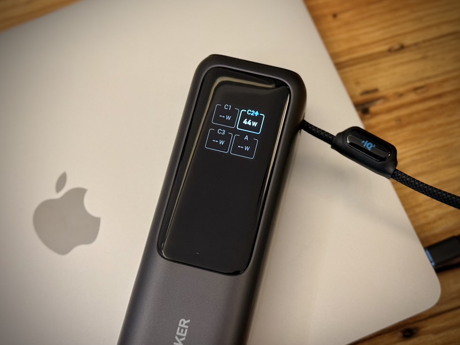 Tu warto powiedzieć wprost: Anker nie udaje, że przy czterech urządzeniach każdy port nadal będzie miał 100 W. Gdy ładujesz dwa urządzenia przez USB-C, powerbank może dostarczyć do 165 W łącznie. Gdy ładujesz trzy lub cztery urządzenia jednocześnie, maksymalna moc wyjściowa spada do 130 W.