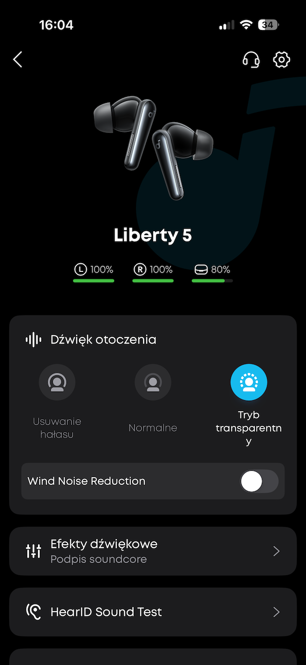 ANC w Liberty 5 jest dokładnie takie, jakie powinno być w tej klasie: użyteczne. Nie robi próżni, nie teleportuje cię do komory bezechowej, ale zdejmie z ciebie ciężar tła. Szum ulicy, monotonia komunikacji, klimatyzacja w biurze, ten niekończący się dźwięk „czegoś” w tle, który męczy mózg bardziej niż hałas. To jest właśnie poziom, który docenia się po godzinie, bo nagle łapiesz się na tym, że słuchasz ciszej, a i tak wszystko jest czytelne.