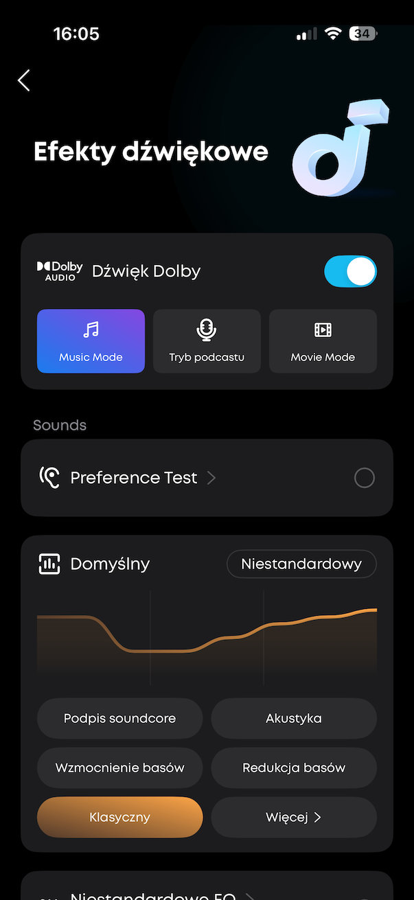 Do tego dochodzi Dolby Audio, czyli ten tryb przestrzeni, który jest świetny… pod warunkiem, że potraktujesz go jak przyprawę. W filmach potrafi dodać efektu, w niektórych gatunkach muzyki robi przyjemną scenę, ale jeśli włączysz go wszędzie, czasem przesunie środek ciężkości w stronę wrażenia, że wokal stoi pół kroku dalej. Ja bym to widziała tak: Dolby do filmów i części playlist, a na co dzień klasyczne granie z dopasowanym EQ. Wtedy Liberty 5 pokazują swój najlepszy charakter.