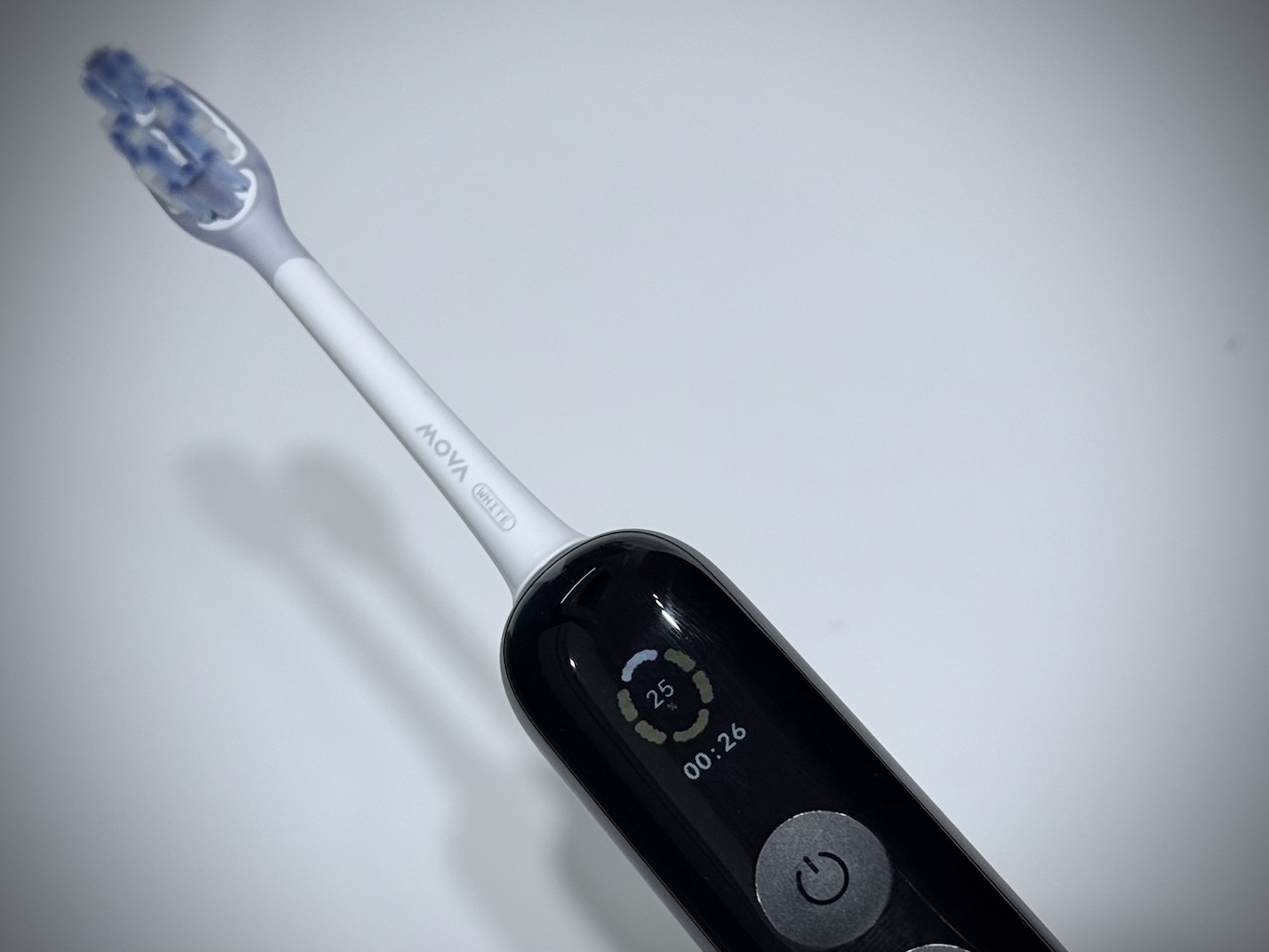 Najciekawszy element tego modelu to system AI Powered Plaque Detection. W dolnej części główki ukryta jest miniaturowa kamera endoskopowa o rozdzielczości 300 tysięcy pikseli, która – w połączeniu z algorytmami rozpoznawania obrazu – analizuje obecność płytki nazębnej na zębach. W praktyce wygląda to tak, że po zastosowaniu detektora płytki i podłączeniu szczoteczki do aplikacji MOVAhome widzisz w czasie zbliżonym do rzeczywistego, gdzie dokładnie płytka się utrzymuje i które miejsca myjesz zbyt pobieżnie.