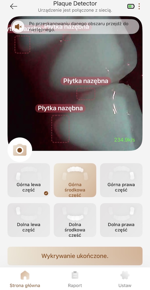To coś więcej niż klasyczny maping oparty o czujniki ruchu, który zgaduje, którą ćwiartkę jamy ustnej właśnie czyścisz. Tutaj szczoteczka faktycznie patrzy na zęby i – na tej podstawie – zaznacza w aplikacji obszary, gdzie wciąż widoczna jest płytka. Efekt jest dość bezlitosny: jeśli masz tendencję do omijania tyłów dolnych trzonowców albo niedomywania wewnętrznych powierzchni górnych zębów, zobaczysz to czarno na białym. Albo raczej różowo fioletowo, jeśli używasz barwnika.