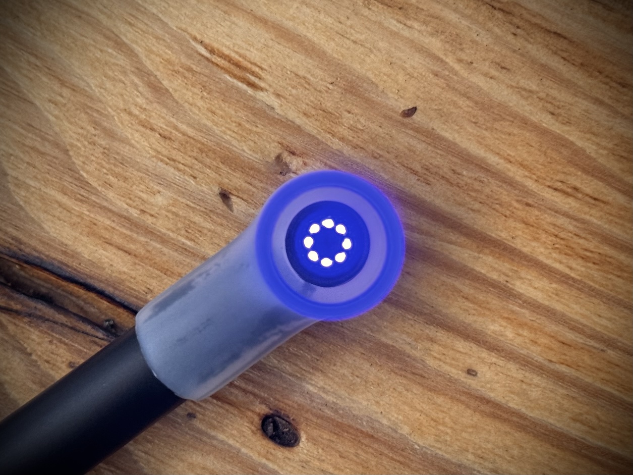 Na tylnej części rękojeści znajduje się pasek podświetlenia SmartSync Light. To wąski, biegnący wzdłuż korpusu element, który podczas mycia zębów świeci na niebiesko, żółto lub czerwono, w zależności od tego, czy nacisk na zęby i dziąsła jest prawidłowy. To proste rozwiązanie, ale dzięki temu nie trzeba zgadywać, czy cisnę za mocno, tylko widzisz to w czasie rzeczywistym, nie odrywając szczoteczki od ust.
