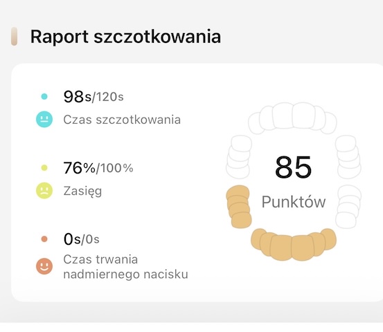 Aplikacja prowadzi przez proces szczotkowania niczym interaktywny trener. Na ekranie widzisz model uzębienia z zaznaczonymi strefami, czas pozostały do końca i procentowo wyrażoną pokrycie – czyli ile powierzchni faktycznie doczyściłeś w tym cyklu. Po zakończeniu mycia generowane są raporty, w których możesz sprawdzić: które miejsca zostają najczęściej niedomyte, jak często przekraczasz zalecany nacisk, ile czasu poświęcasz na poszczególne strefy i jak zmienia się stan płytki w czasie.