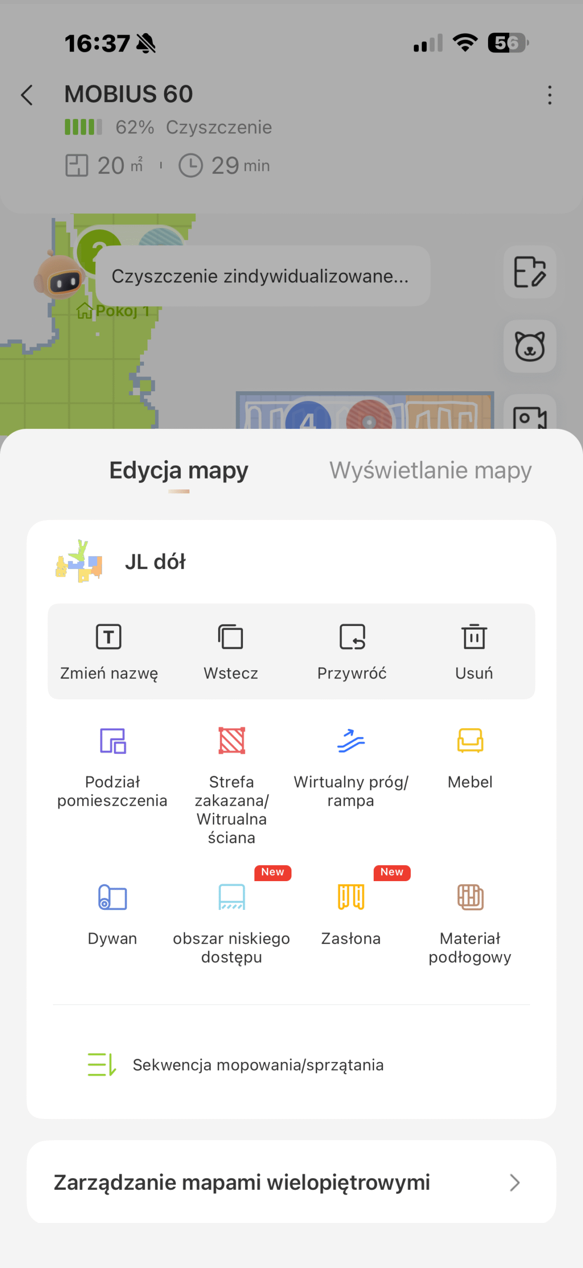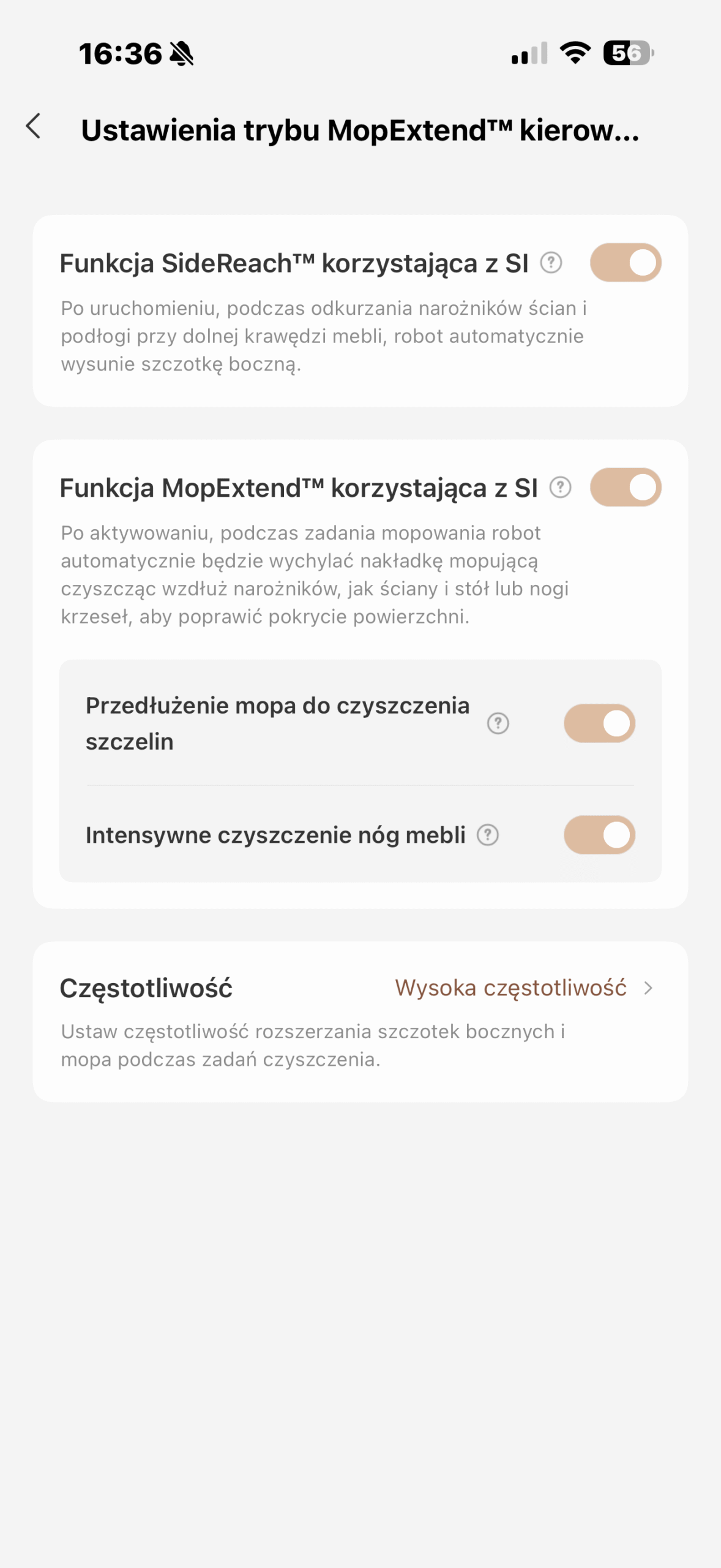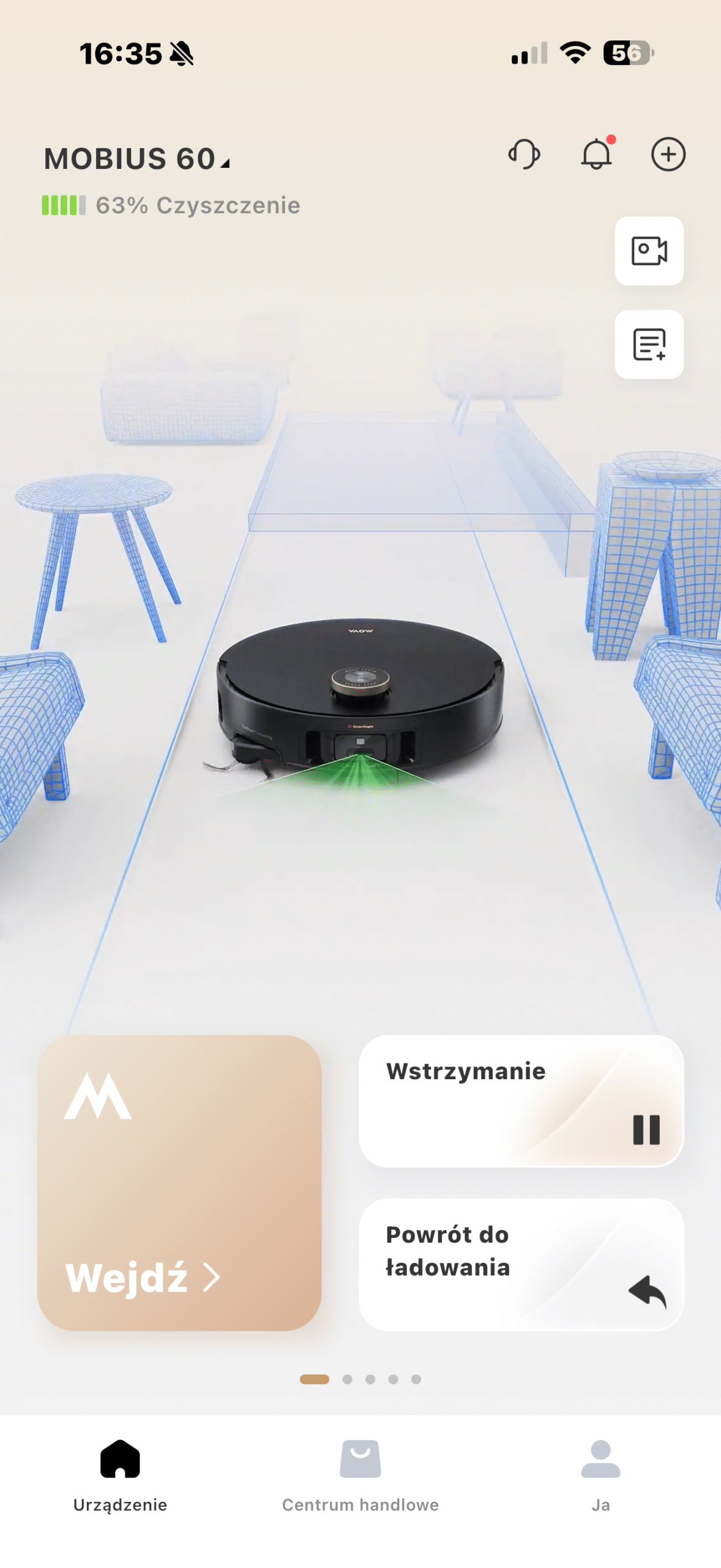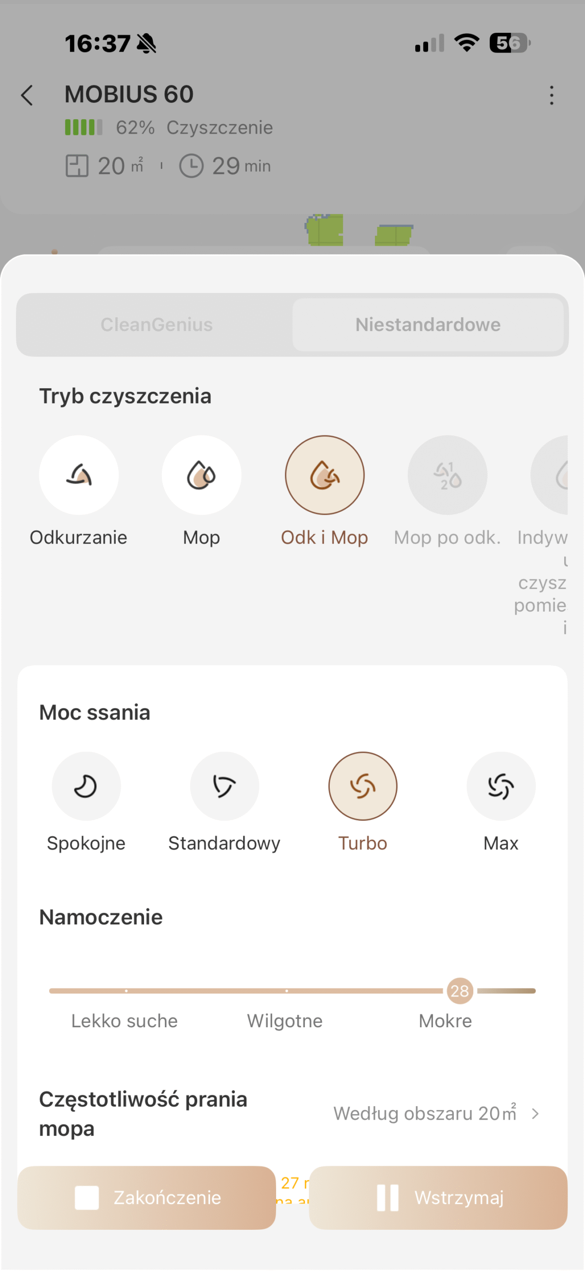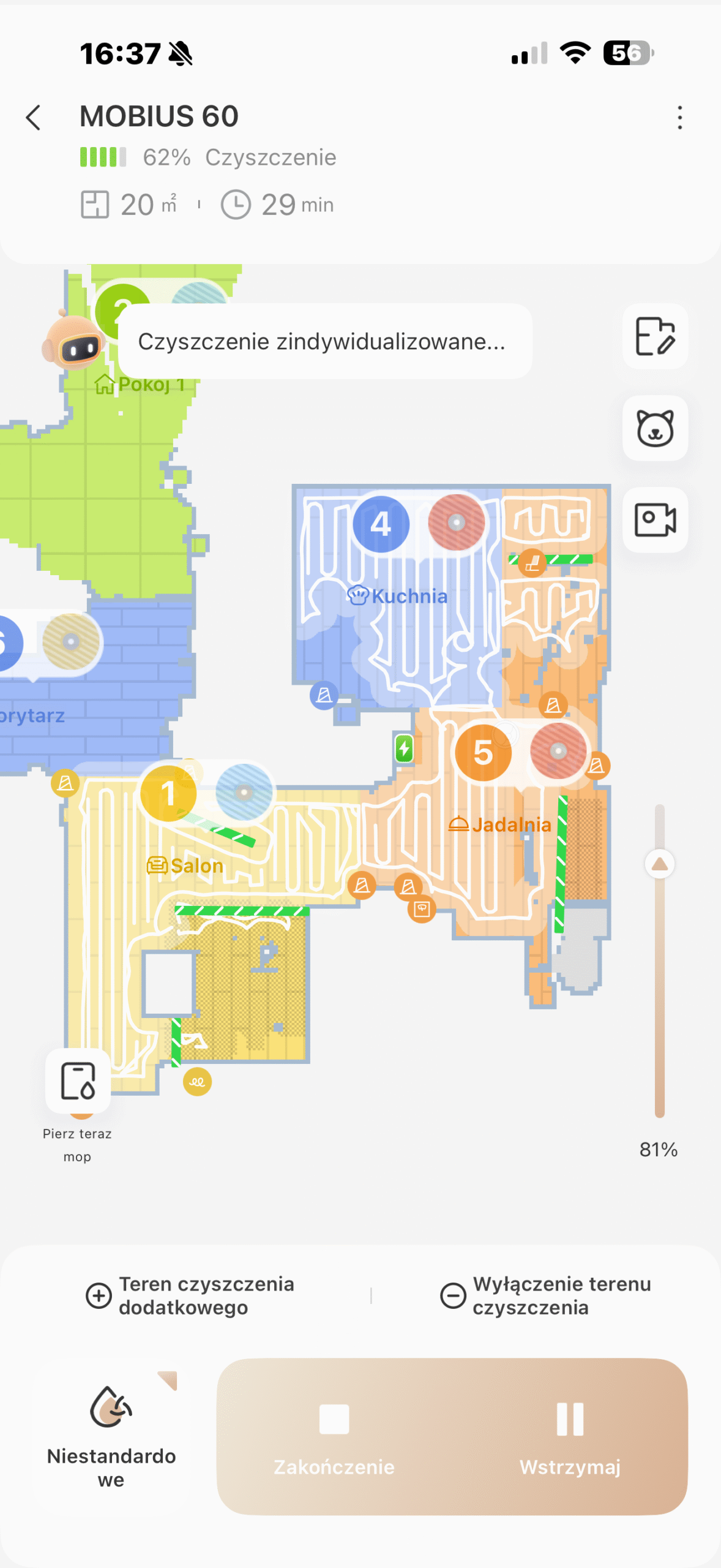 Mopowanie to ta funkcja, którą Mobius 60 najbardziej się wyróżnia. Jest jednym z pierwszych robotów na polskim rynku, który potrafi automatycznie zmieniać rodzaj padów mopujących zależnie od tego, do której strefy wjeżdża. Kuchnia może być przypisana do mopów ThermoHold, salon do HyperClean, a sypialnia do delikatnych Plush Mop. Robot dojeżdża do stacji, wymienia mopy i dopiero potem jedzie w kolejną część mieszkania.