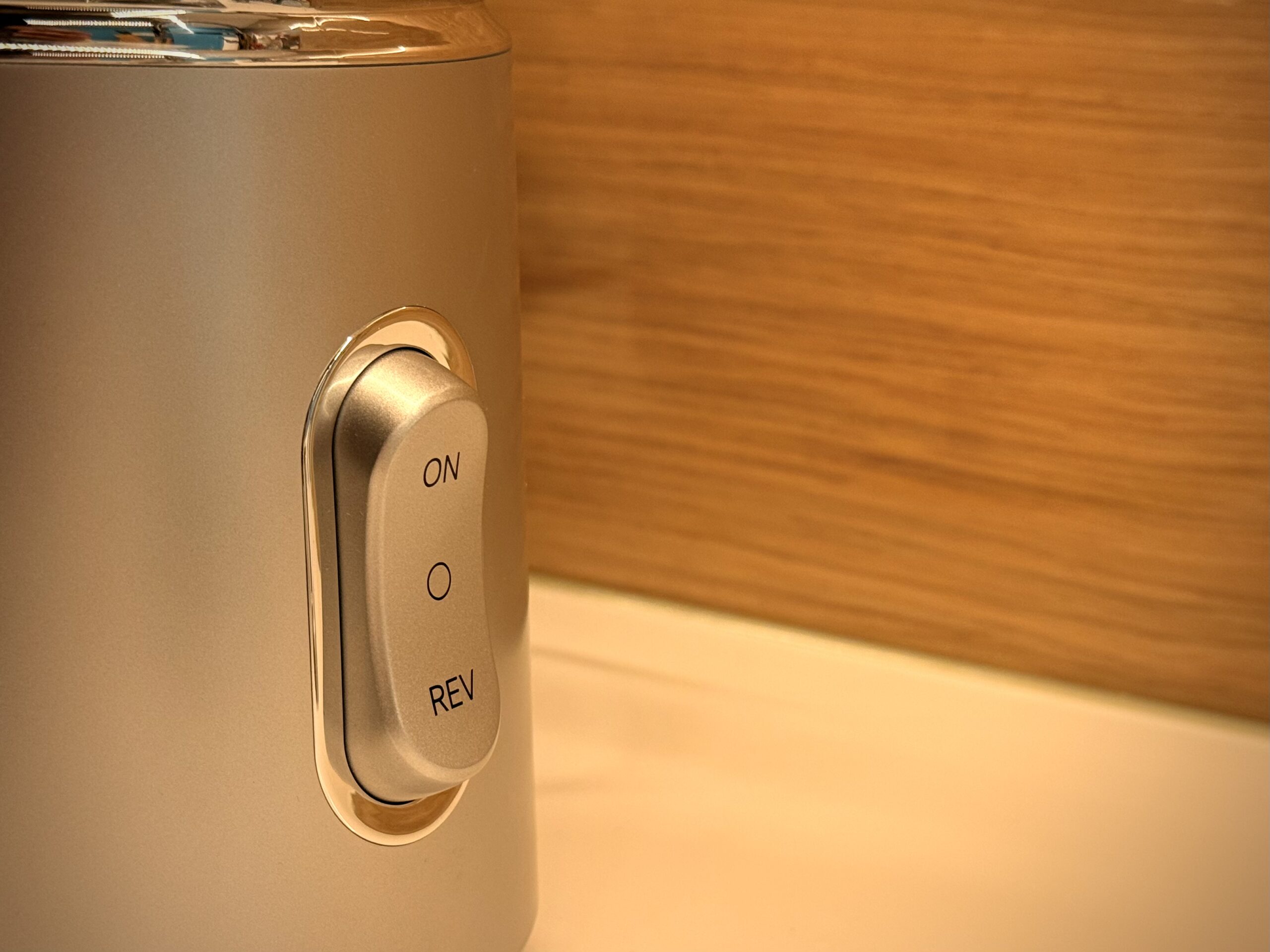 Sterowanie wyciskarką jest skrajnie proste. Do dyspozycji masz jeden przełącznik z trzema pozycjami: praca w przód, pozycja zerowa i bieg wsteczny. Reverse przydaje się wtedy, gdy jakiś fragment owocu lub warzywa zaklinuje się w okolicy ślimaka – krótki ruch wstecz, radykalnie mniej frustracji.