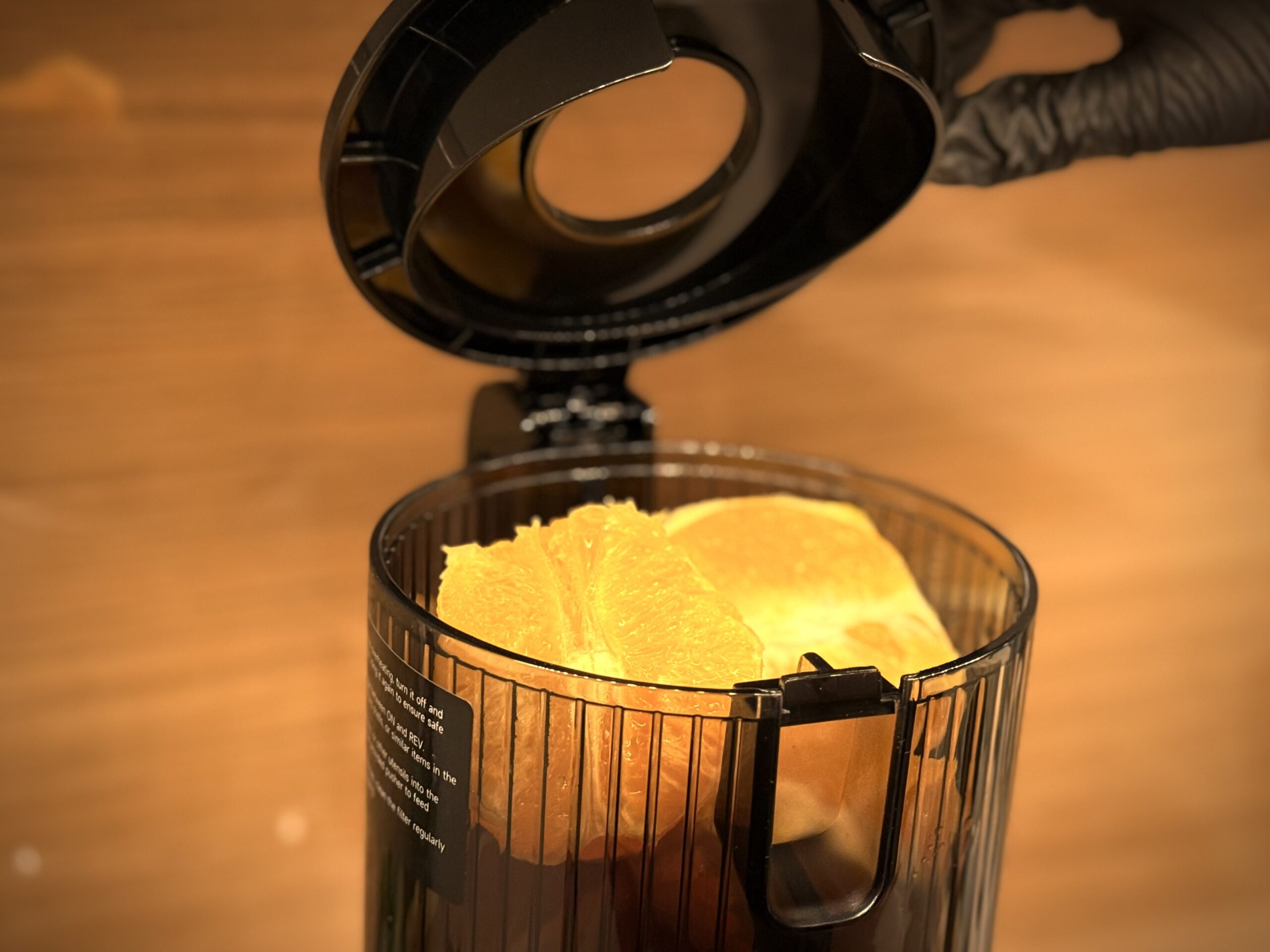 W przypadku moich ulubionych soków cytrusowych – pomarańcze i grejpfruty – MOVA radzi sobie z imponującą szybkością. Pełna miska owoców znika w około trzy minuty, w pojemniku zostaje gęsty sok, w komorze minimalna ilość miąższu, a w niszy ślimaka pojedyncze pestki, które po prostu przeskoczyły przez sito. W praktyce oznacza to mało strat i niewiele roboty przy czyszczeniu.